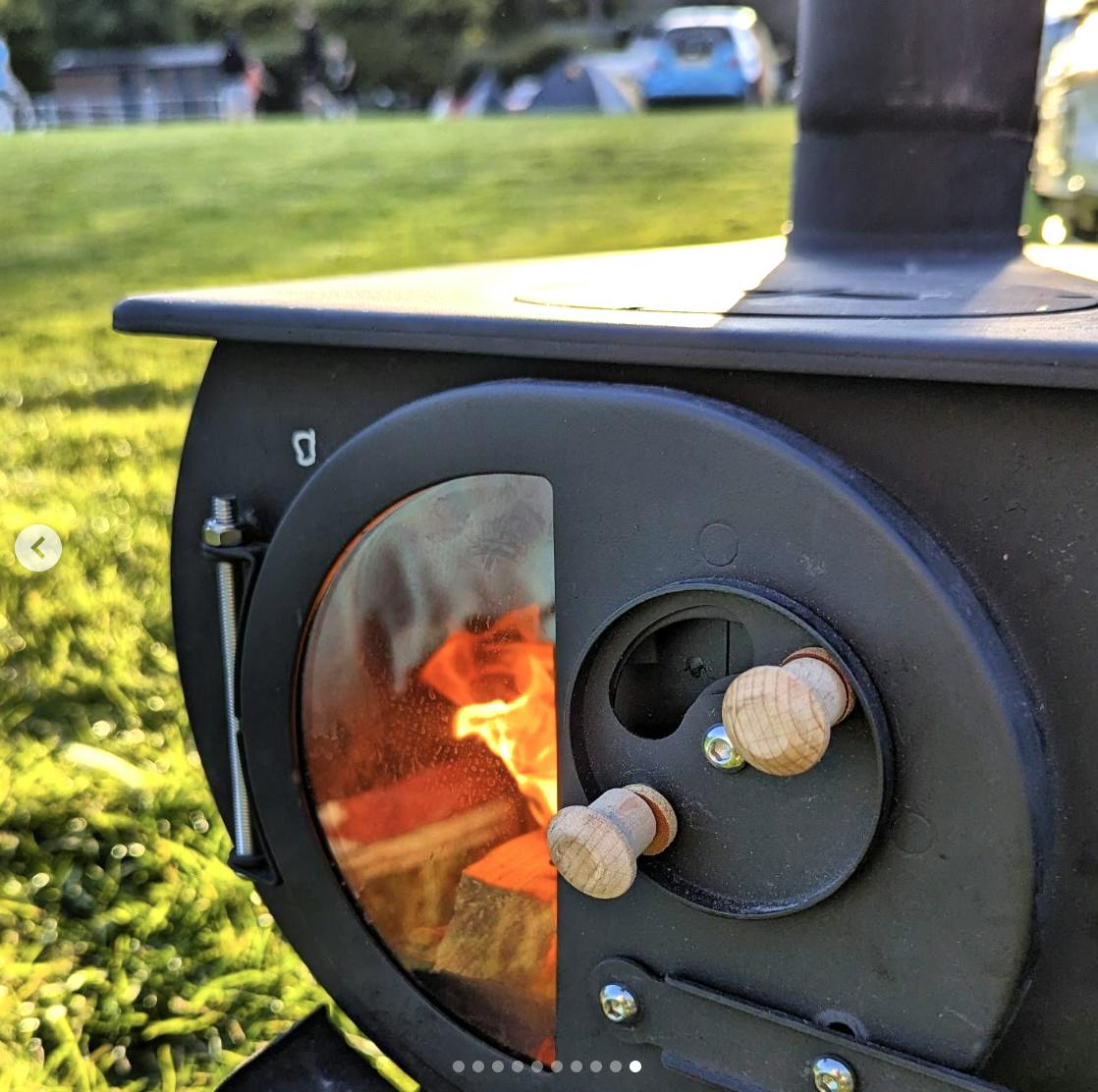 Anevay Frontier Plus - set up on the Cornish coast with a woman bent over the stove, cooking lunch - Outdoor Wood Burning Stove